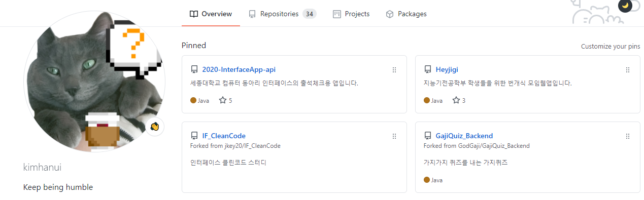 Pinned repository에 내가 소개하는 프로젝트들을 고정해놨고, 이제야 Readme.md파일을 좀 신경 써서 작성했다!!