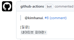 - 각 Item 별 이슈에 코멘트로 질문 등록시 [질문] 키워드로 시작하게 작성하면-> 깃헙 액션이 동작해서 작업을 수행하고 -> 내가 등록했던 질문에 🚀 reaction을 달아준다.