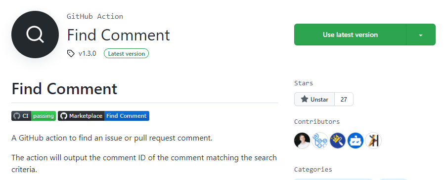 우선 목표는 생겼는데 어떻게 만드는지 몰라서 단순하게 'github action 코멘트'라고 검색했다. 그랬더니 Github Marketplace에 있는 Create or Update Comment라는 Action을 찾을 수 있었다. 추후 Github Action에 필요한 파일을 작성하면서 알게 모르게 사용한 job이 Find Comment라는 Action이란 걸 알게됐다(같은 개발자의 개발물).