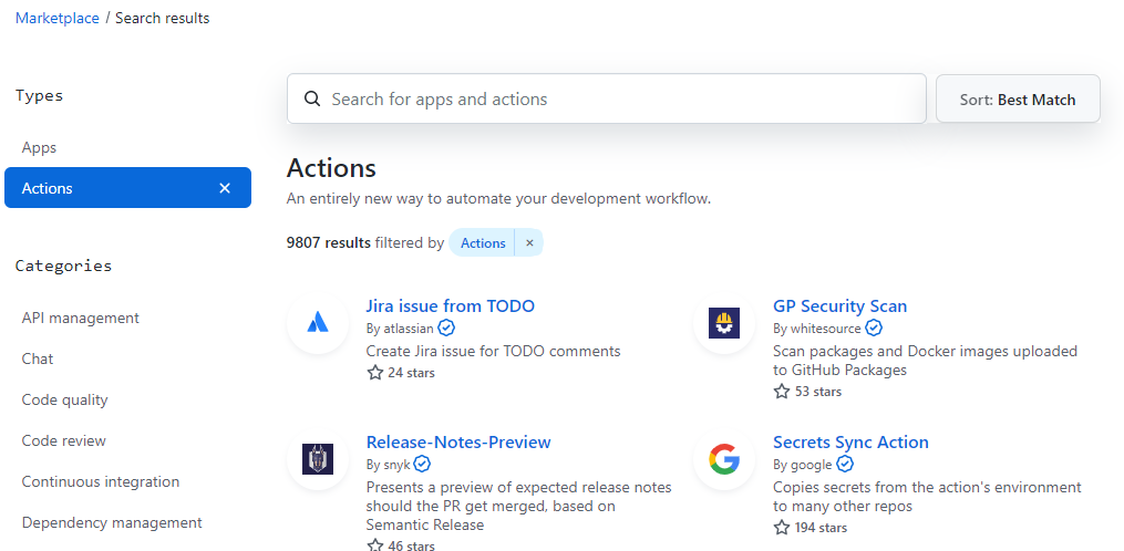 - 각 step은 run이나 name으로 시작할 수 있다. run은 내가 직접 작성해야하고 name과 used에은 Github Marketplaces에 올라와있는 Actions 들 중에 사용할 것들을 써준다.
